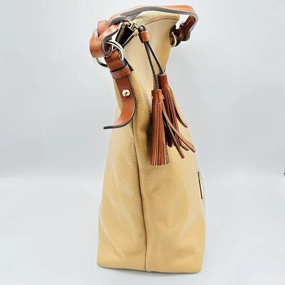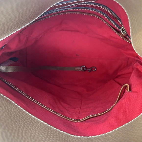 The Pebble Grain Collection is renowned for the rich texture and exceptional durability of its leather. The Sloan is a slouchy hobo pairing rich pebbled leather with a chunky zipper and large tassel pulls.• Preloved in Good Condition - Some signs of minor wear. Inside needs some minor cleaning.• Rich European pebble grain leather.• Zipper closure.• Handle drop length: 12".• H 13.5" x W 5" x L 11.5"• 1 lb 14 oz• Designed in Norwalk, CT by Peter Dooney• One inside zip pocket. Two inside pockets.•Cell phone pocket• Inside key hook• Lined