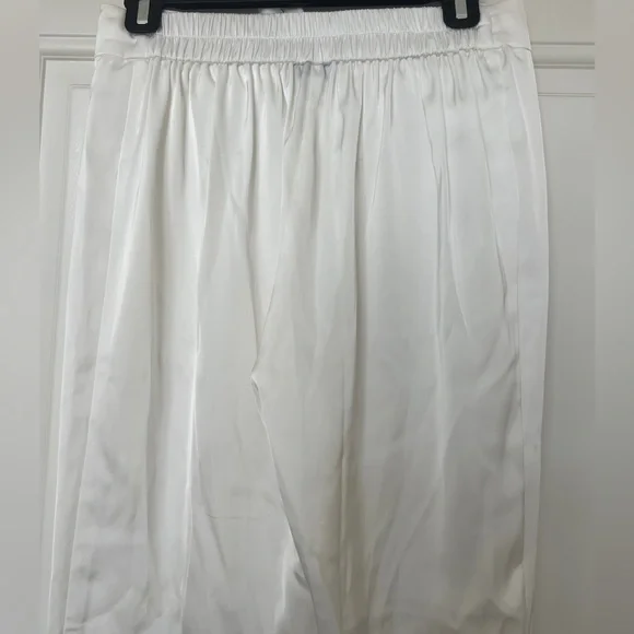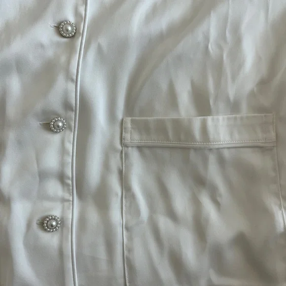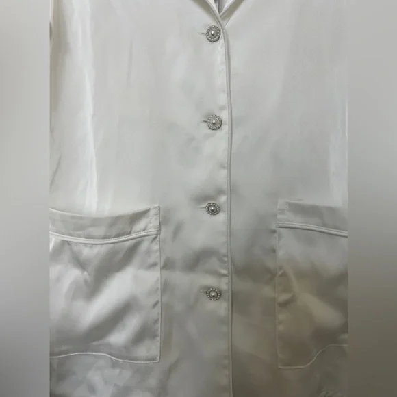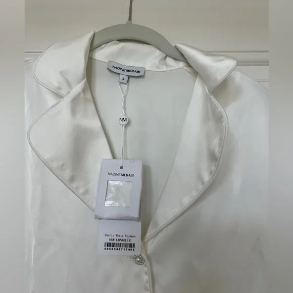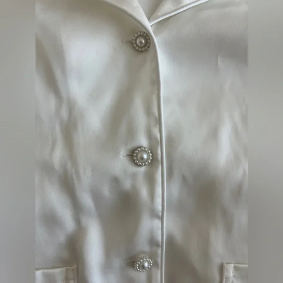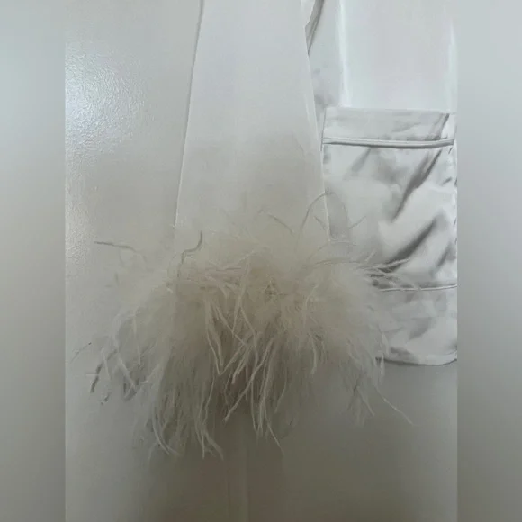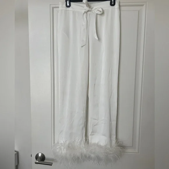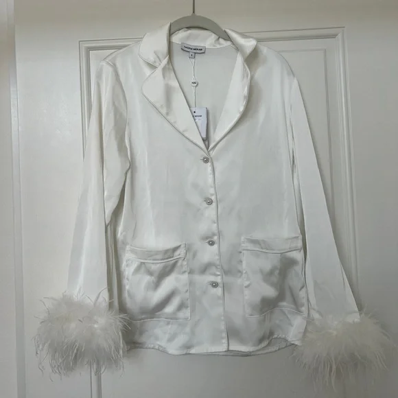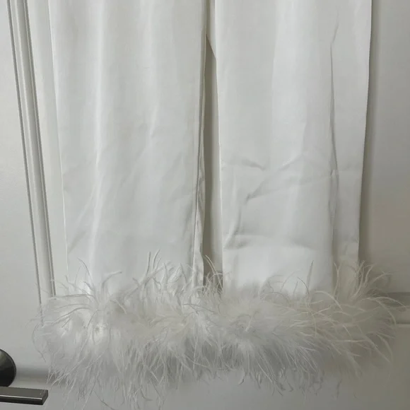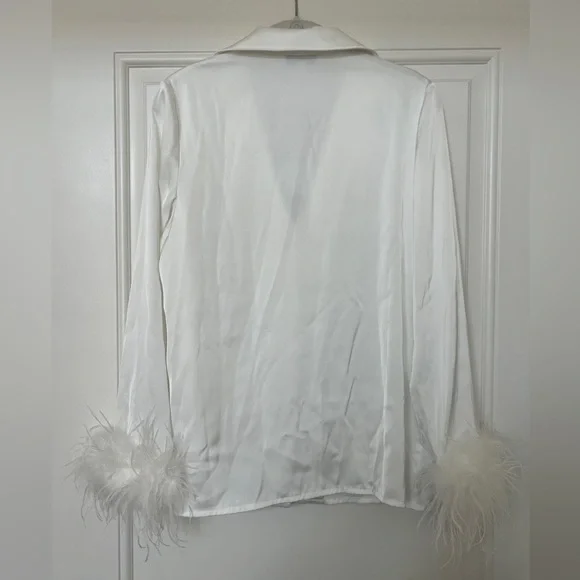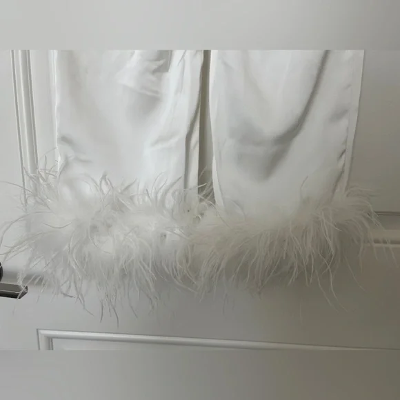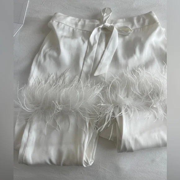 CALLING ALL BRIDES! Beautiful silk feather pajamas set with diamond buttons. With tags, only worn for a few photos!-Exclusively designed silk touch fabric-White feather trim to cuff on the trouser and the shirt-Diamante buttons-White satin binding to shirt cuffs and trouser cuffs-Elasticated waist for a smooth, comfortable fit